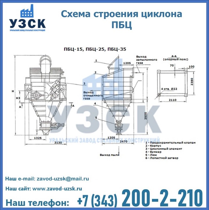 Завод «УЗСК» в Жезказгане предлагает приобрести циклоны ПБЦ и прочие устройства, полностью укомплектованные и готовые к эксплуатации. Мы гарантируем соответствие оборудования всем требованиям ГОСТ и ТУ, износостойкость и высокую производительность предлагаемого оборудования. Уральский Завод Стальных Конструкций изготавливает и продает надежное, эффективное и производительное оборудование, имеющее длительную гарантию и большой эксплуатационный ресурс. Если требуется изготовить циклон нестандартных размеров, то такой вариант выполнения заказа тоже предусмотрен, так как предприятие имеет собственные производственные площади и надежных поставщиков. На все поставляемое или производимое оборудование имеются чертежи и прочая техническая документация. Заказать и купить циклоны или прочее оборудование высокого качества и по доступной цене можно через наш сайт или по указанному в разделе «Контакты» телефону.